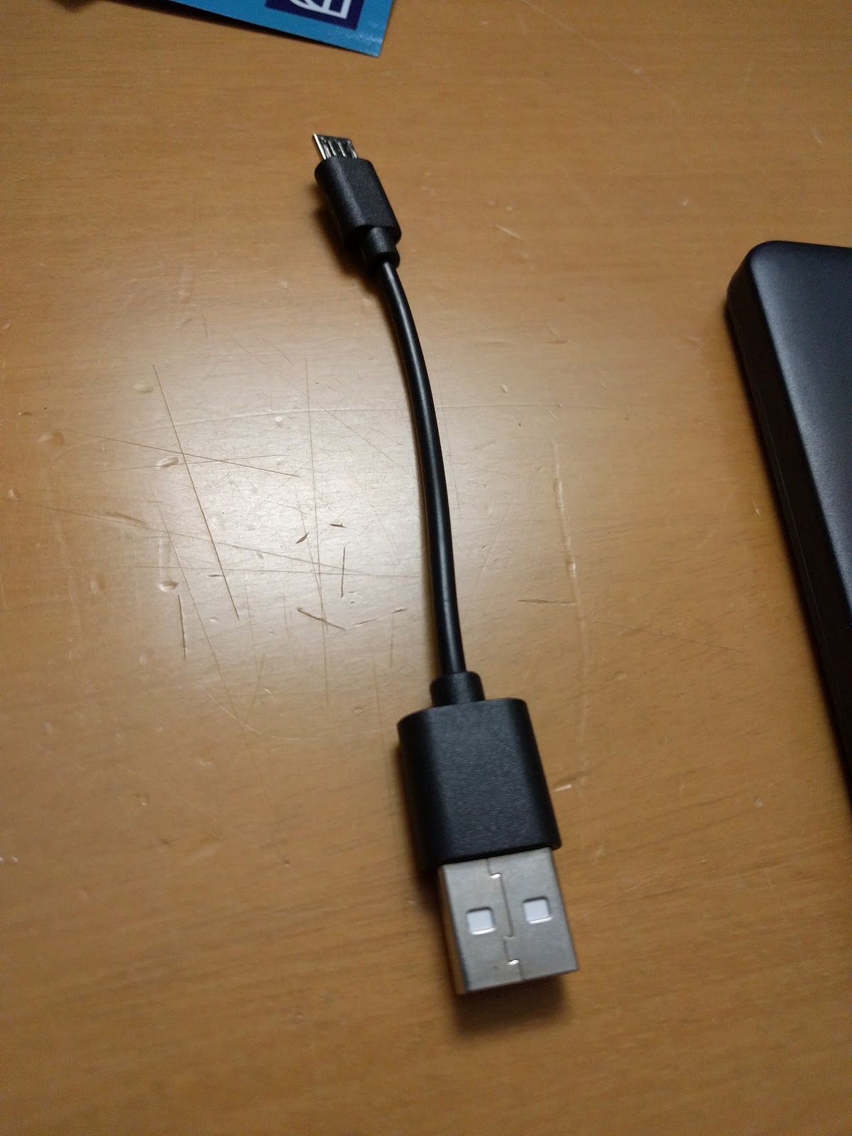 500円でした。まずは外観から。microUSBでの給電とUSB Aでの出力です。基本的ですね。10cmほどのケーブルも付属しています。